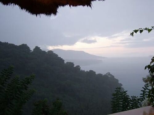 Fukunosukeです。 6月27日(水)/5日目の朝 明け方、アランアランの屋根をパタパタ叩く雨音で目が覚めた。 ちぇっ、雨かー。 ビーチクラブの椰子の木も、白くぼうッとけぶる。 この写真を叔母に見せたら「わぁ、すごい素敵!地獄の黙示録みたい!」 ハハハ(…