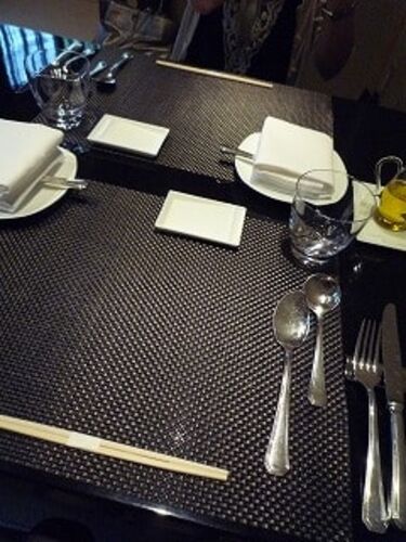 hiyokoです。 ル・サルモン・ドールでの至福のランチ。こんなものをいただきました。 掘りごたつ式のテーブルにはチルウィッチのランチョンマットにお箸も。お水はオレッツァをセレクト。 チルウィッチってなかなかのお値段ですが、daniellaちゃんがアトラン…