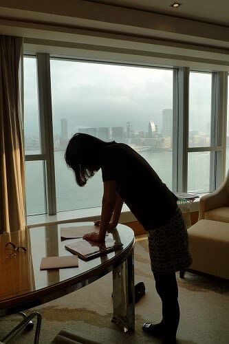 Fukunosukeです。 部屋からの眺めを点検。 何故か反省猿ポーズのhiyoko。邪魔だからどいてちょうだい。 真ん中左ののっぽビルは、リッツが入っているビル。その足元には、 ベッティーナさん達が泊まったWホテルがあります。 もう少し晴れていると、朝日に輝…