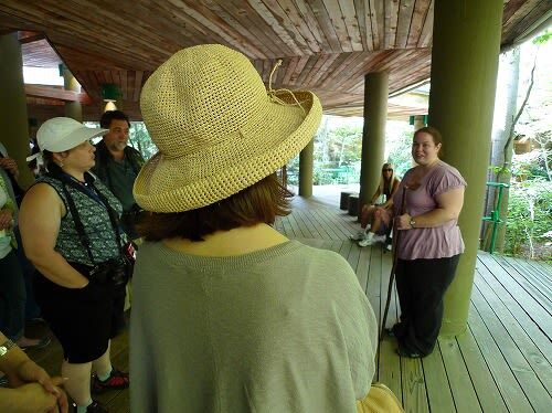 Fukunosukeです。 izolaさんもアメリカレポートあっぷちゅう Fallingwaterでは、ガイド付きのツアーに参加しました。館内をくまなく回ります。 hiyokoより:つい、左右の女性に目が行ってしまいそうですが、実は奥のベンチに座っている 金髪でサングラスの女…