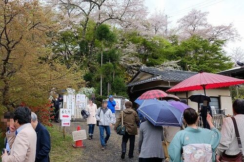 Fukunosukeです。 この日(4/6)はあいにくの天気。雨もパラパラ。 4月の初めだというのに、今年は桜が早く中心部のソメイヨシノは既に終了。でもizolaさんがとっておきの桜の名所に連れていってくれました。 原谷苑というそうです。 おわ! いきなり大満開の…