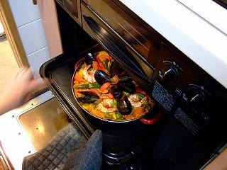 エビ、ムール貝も乗っけて、一気に沸騰するまで火にかけます。