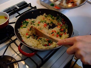続いて、生米を投入!米の色が白くなるまでちょっと炒めます。