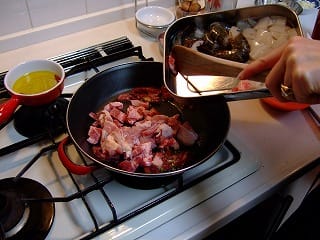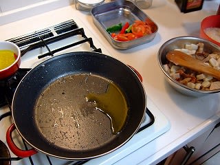 パエリアパンにオリーブオイルをひいて、お肉系を炒めます。