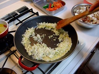 パエリアパンに、油を少し足して、にんにくと玉葱を炒めます。