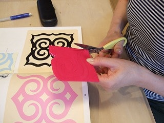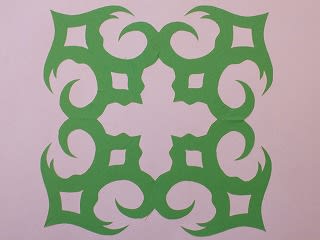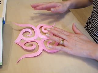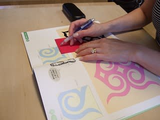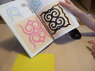 図柄が決まったら、四つ折にした折り紙に、見本に