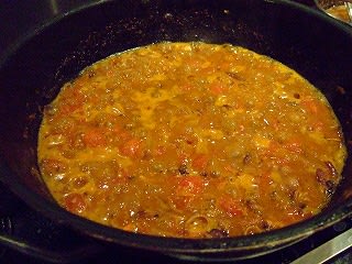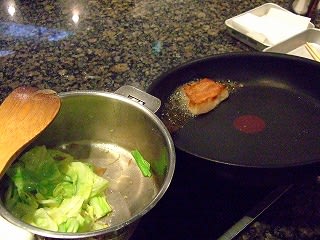 一つは、オリーブ油を入れた鍋ににんにく、薄切りの玉葱、キャベツ、