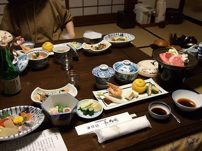 さて夕飯は、、、。おっと一度に全部料理が並んでしまいました、、、。