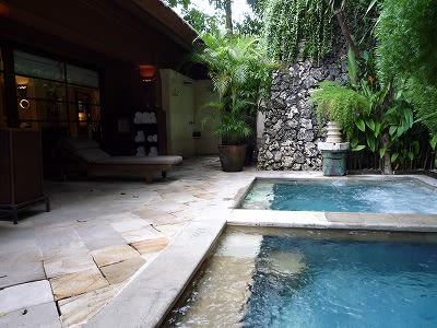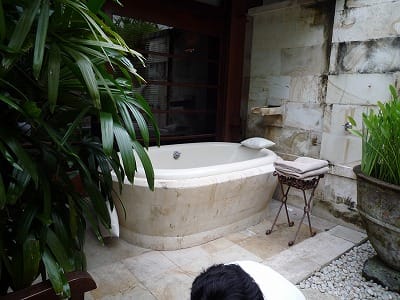 トリートメントルームには、庭が付いていてバスタブ、アウトシャワー
