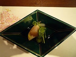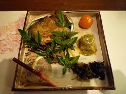 鮑のステーキ、独活と粟麩、鯖の棒寿司、金柑、蕗、山葵