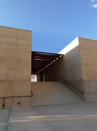 階段を上ったところ。天井のファブリック、スリットから差し込む陽の光。奥には、、、