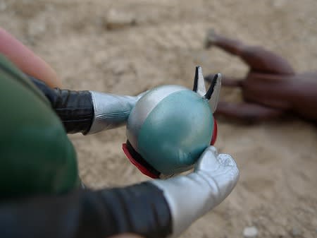 ライダーマスクってちょっと息苦しいですねー。