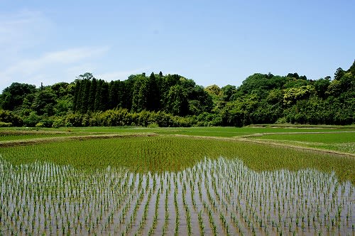 田植えを終えたばかりの水田。初夏の里山の景色が広がっています。何だか心に染みる。
